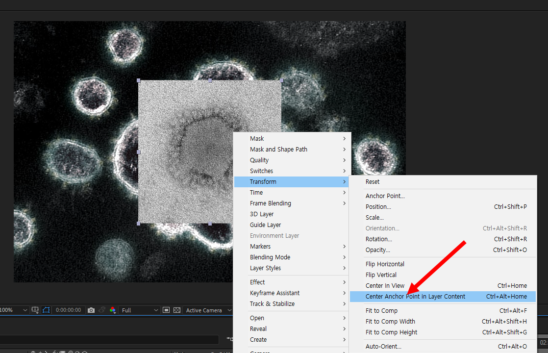 6)앵커포인트를 레이어의 중심으로 설정하려면 레이어를 선택하고 마우스 우클릭후 transform의 center anchor point in layer content를 선택합니다.