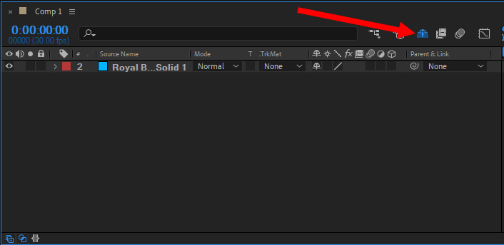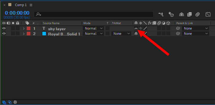 4)아래 표시하곳을 활성화 및 비활성화하면 shy layer로 설정한 모든 레이어를 타임라인에서 숨기기 또는 보이기할수있습니다. 타임라인에서 shy레이어로 설정한 텍스트 레이어가 표시되지않는것을 확인할수있습니다.
