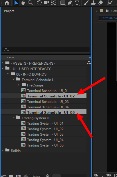 1)프로젝트(project) 패널에서 프로젝트에 사용중인 컴포지션을 선택합니다. 예에서 프로젝트에서 사용되지않는 컴포지션을 제외하고 두개의 컴포지션을 선택하였습니다.