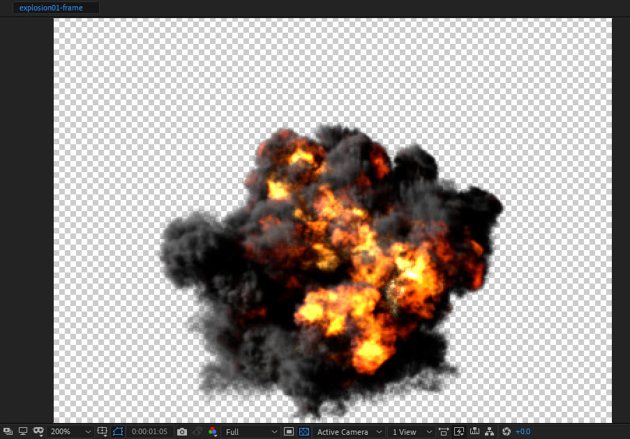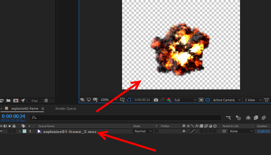 9)렌더링한 동영상을 프로젝트에 가져오기하고 컴포지션에 추가하여 확인합니다. 알파채널을 포함하고 투명한 영역을 가지는것을 확인할수있습니다.