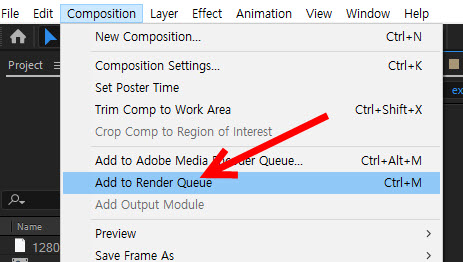 5)상단의 composition 메뉴에서 add to render queue로 이동합니다.