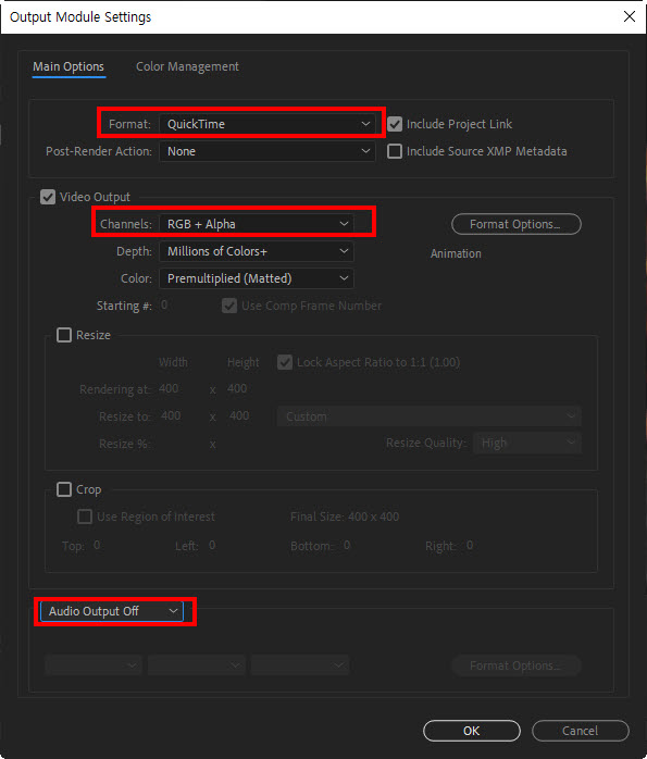 에프터이펙트(after effect)에서 알파 채널을 포함하여 동영상을 저장하는 방법(quicktime, RGB+Alpha)