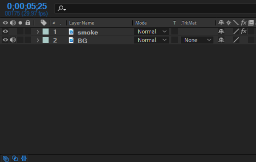 1)새로운 컴포지션을 생성하고 배경에 사용할 동영상(BG)과 흑백으로 이루어진 동영상(smkoe)을 추가합니다.