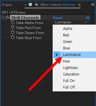 에프터이펙트(after effect)에서 shift channels 이펙트를 사용한 합성(take alpha from luminance)