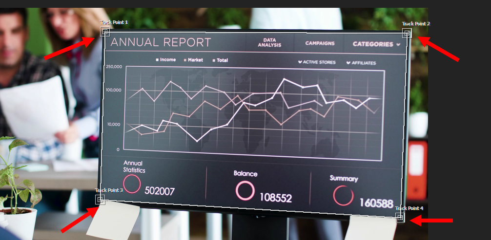 트랙모션(track motion)의 perpective corner pin을 사용하여 스크린 영역을 설정하고 모션을 분석한후 해당 영역에 다른 푸티지를 표시하는 과정입니다.