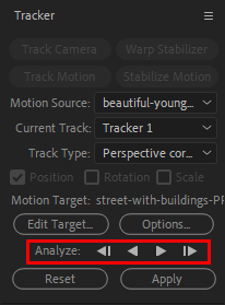 6)analyze를 사용하여 현재 프레임의 전후로 모션트래킹을 실행합니(analyze forward, backward, 1frame forward, 1frame backward)