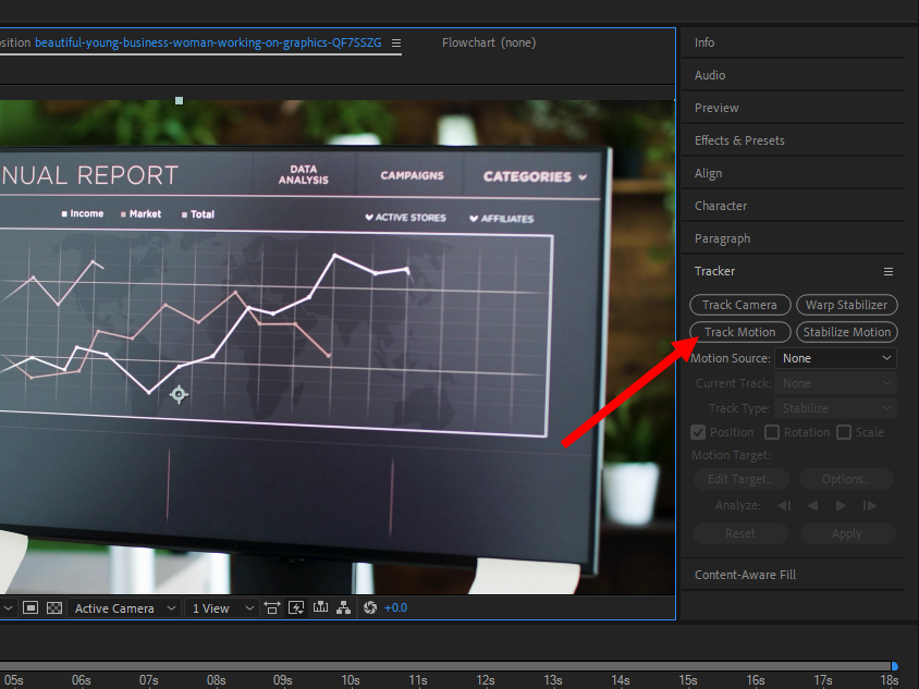 1)동영상의 모션을 트래킹하려면 컴포지션의 동영상을 선택하고 tracker 패널에서 track motion을 클릭합니다.