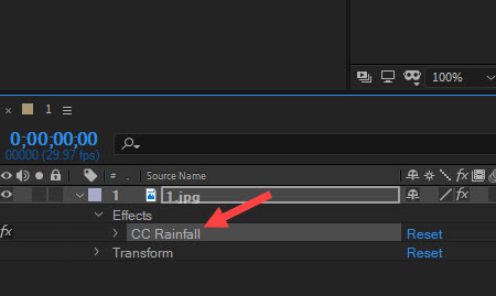 3)effects & preset 패널에서 CC rainfall를 검색하고 이미지 레이어에 이펙트를 추가합니다.