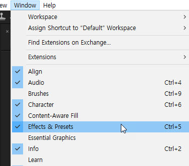 2)상단의 window 메뉴에서 effects & preset에 체크합니다.