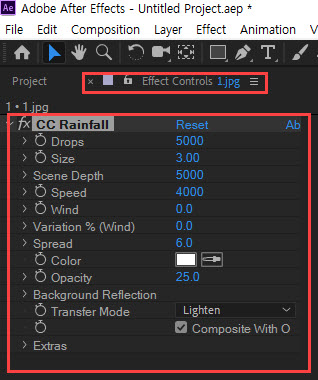 5)레이어에 추가된 effects 또는 effect controls 패널에서 CC rainfall의 속성들에 대해서 설정할수있습니다.