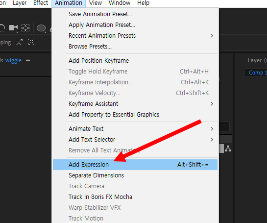3)상단의 animation 메뉴에서 add expression을 선택합니다(또는 alt + position 속성 클릭으로 expression을 추가)