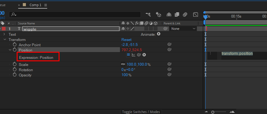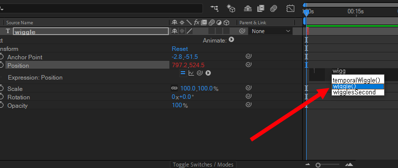 5)position 속성을 선택하고 우측의 타임라인을 클릭한후 wiggle()함수를 입력합니다.