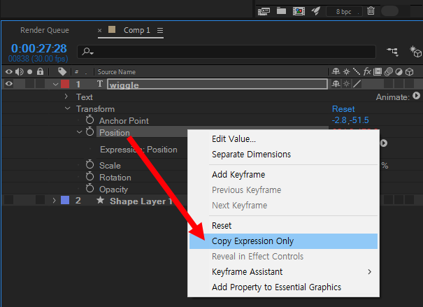7)함수를 다른 레이어에 복사하려면 속성을 우클릭하고 copy expression only를 선택합니다.