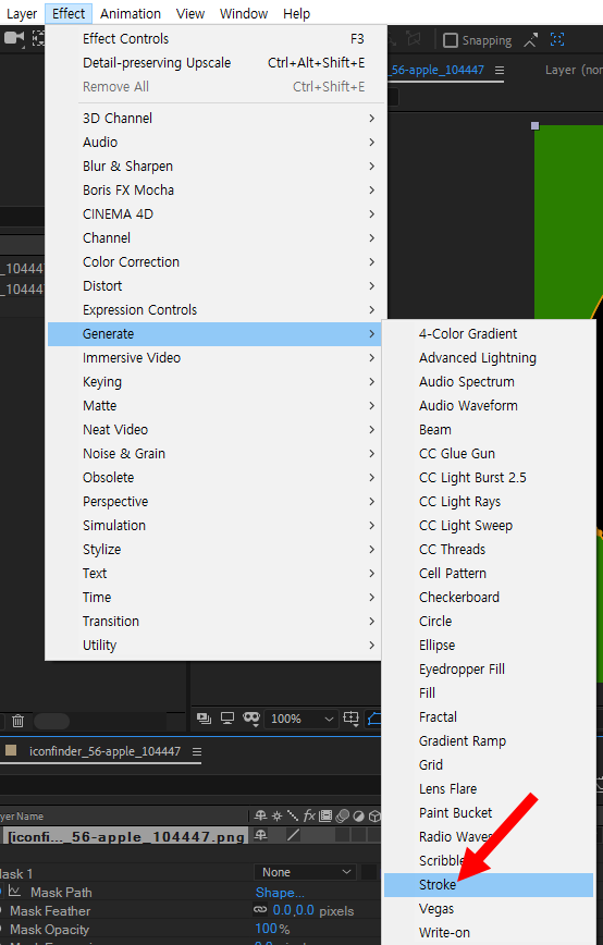 5)상단의 effect 메뉴에서 generate의 stroke를 선택하면 알파 영역의 경계에 stroke를 생성합니다.