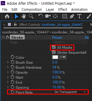 6)stroke 이펙트의 all masks에 체크하고 paint style에서 on transparent를 선택합니다.