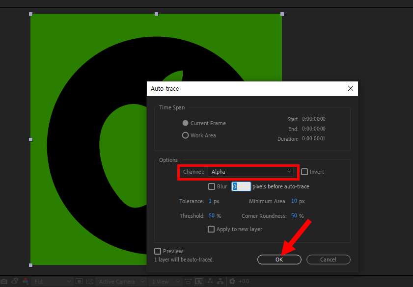 3)auto-trace 옵션에서 알파채널을 선택하고 확인합니다.