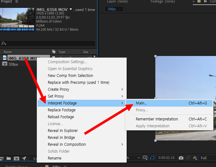 2)컴포지션에 동영상을 추가합니다. 동영상을 반복 재생하도록 설정하려면 프로젝트에서 동영상 또는 시퀀스의 소스를 선택, 마우스 우클릭한후 interpret footage의 main으로이동합니다.