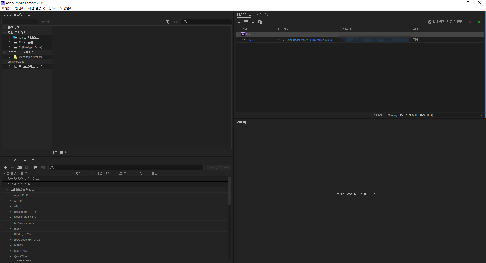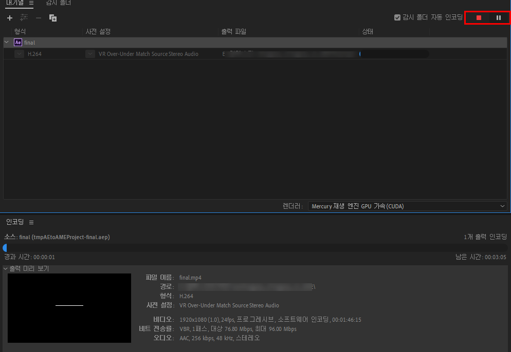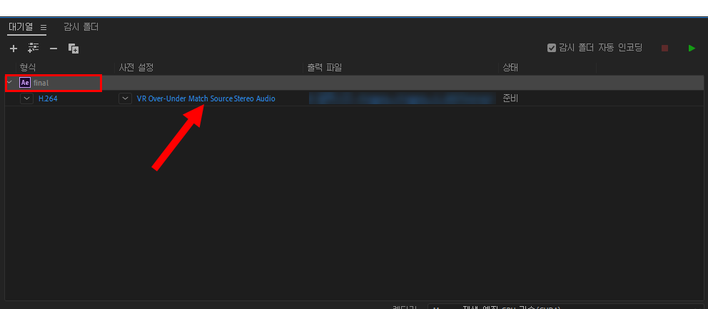 3)미디어 인코더가 실행되고 해당 컴포지션이 대기열에 추가된것을 확인할수있습니다.