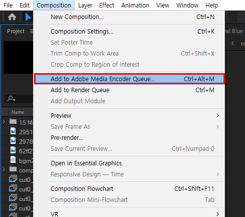 2)상단의 composition 메뉴에서 add to adobe media encoder queue를 선택합니다.