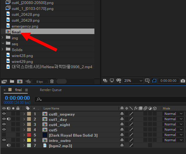 1)프로젝트에서 동영상으로 출력하려는 컴포지션을 선택합니다.
