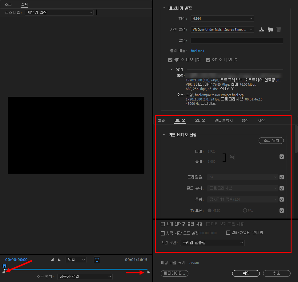 6)비디오, 오디오 및 기타에 대해서 사용자 설정할수있고 좌측 하단에서 출력할 동영상의 범위를 선택할수있습니다.
