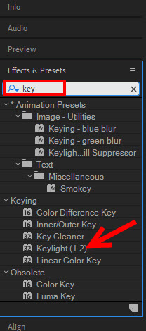 2)동영상을 선택하고 effect & presets에서 keylight(1,2)를 추가합니다.