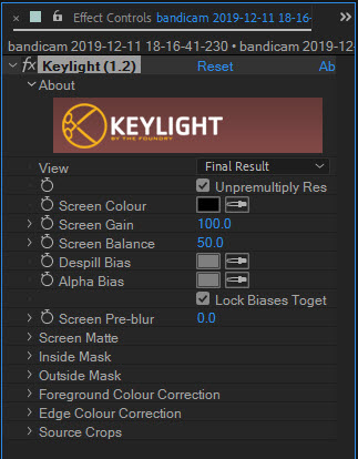 3)effect controls 패널에서 키라이트의 속성을 설정합니다.