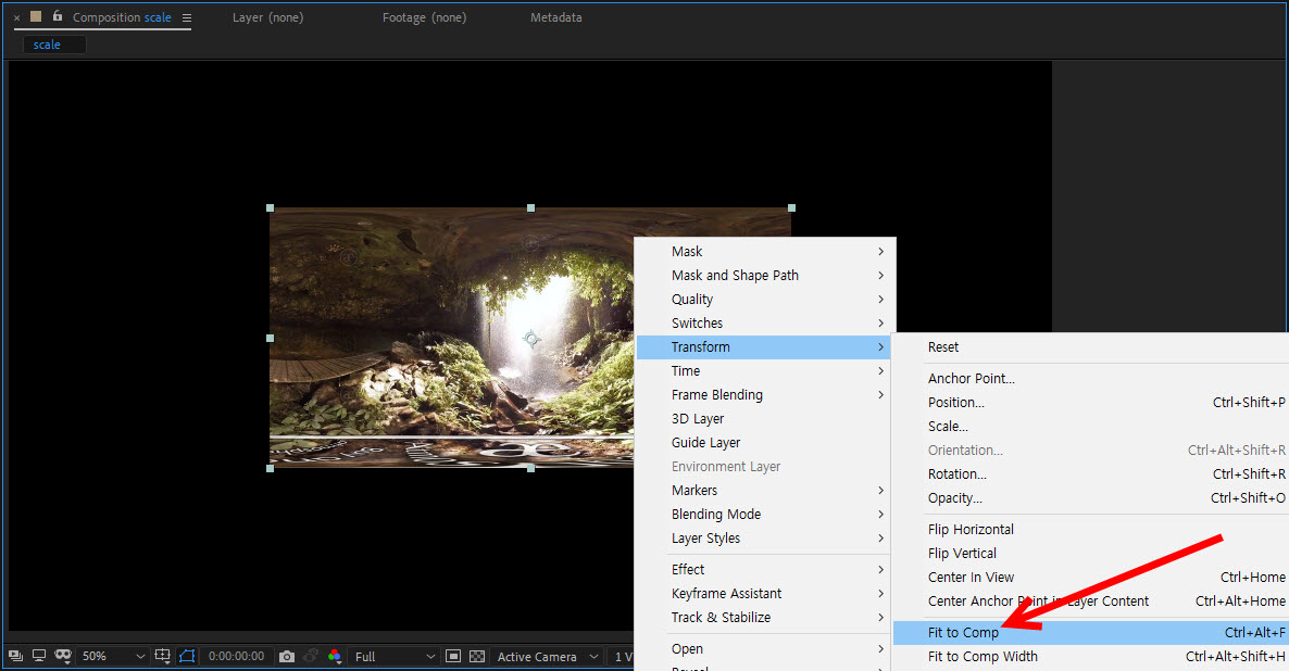 6)fit to comp width, fit to comp height 또는 scale를 사용해서 동영상의 크기를 키웁니다.