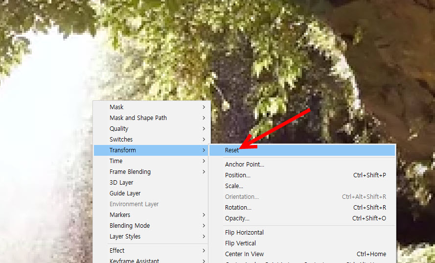 4)동영상을 선택하고 마우스 우클릭한후 transform의 reset을 선택합니다.