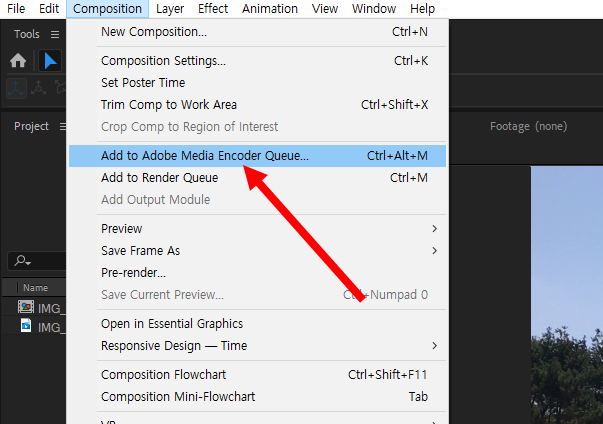 7)상단의 composition 메뉴에서 add to adobe media encoder queue로 이동합니다.