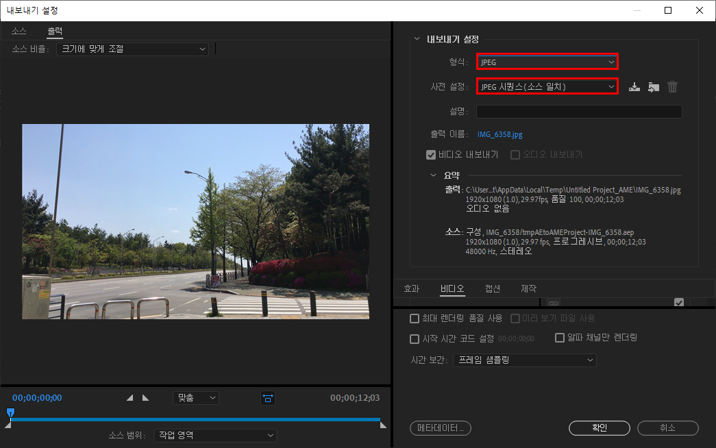 8)미디어인코더에서 내보내기 형식을 설정합니다(jpeg 시퀀스)