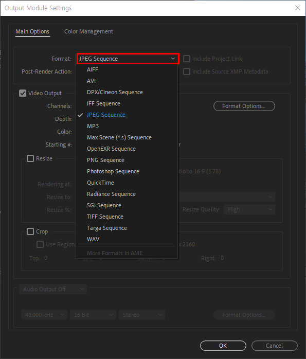4)포맷에서 이미지시퀀스를 선택합니다. 예에서 jpeg sequence를 선택하였습니다.