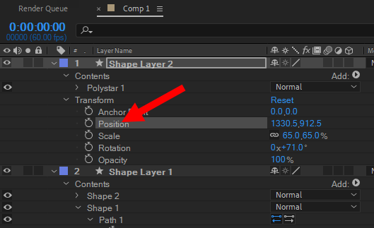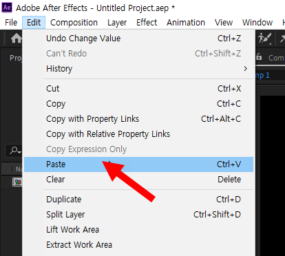 8)레이어(shape layer2)에서 transform의 position 속성을 선택하고 상단의 edit 메뉴에서 paste를 선택합니다(ctrl+v)