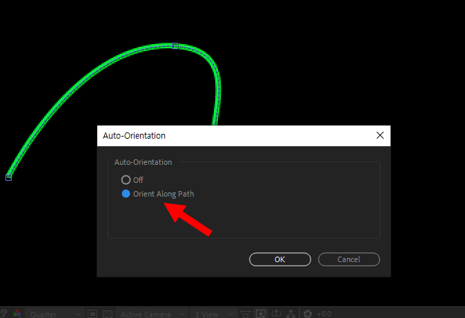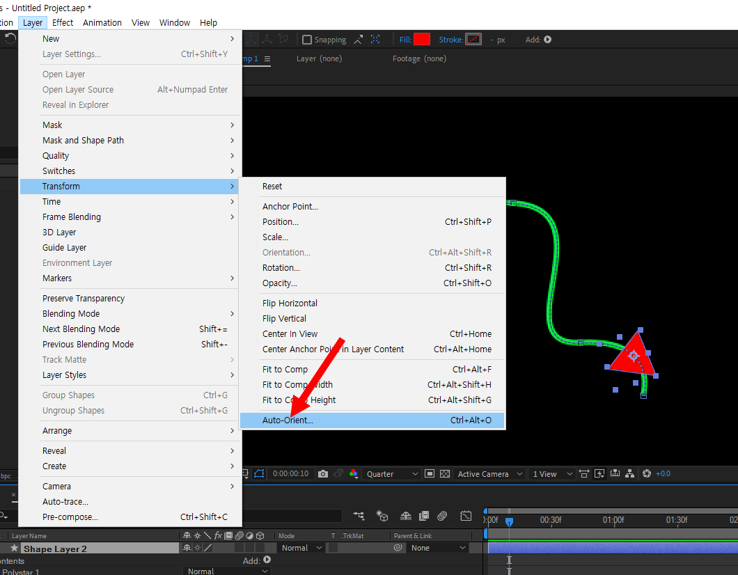 10)오브젝트의 축을 path의 방향과 일치시키려면 레이어(shape layer2)를 선택하고 상단의 layer 메뉴에서 transform>auto orient를 선택합니다.