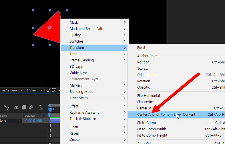6)레이어(shape layer2)를 선택하고 마우스 우클릭한후 transform의 center anchor point in layer content를 선택합니다.