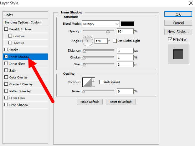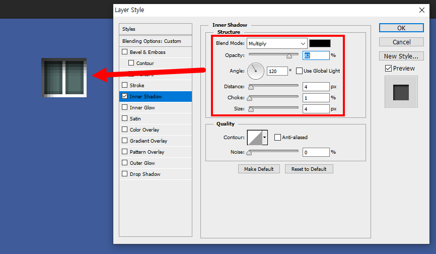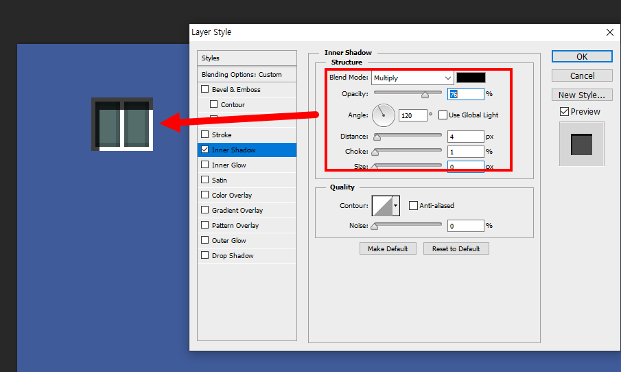 16)inner shadow 레이어 스타일을 설정한다.