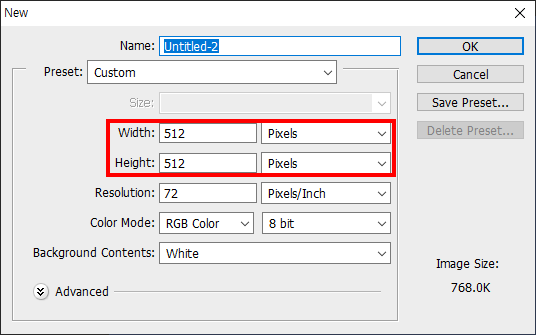 1)포토샵에서 512 x 512 해상도의 새로운 문서를 생성한다.