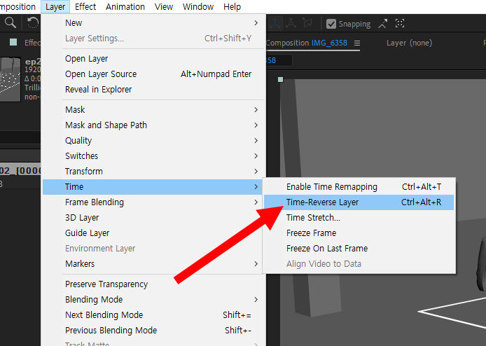 3)동영상 레이어를 선택하고 상단의 layer 메뉴에서 time의 time-reverse layer를 선택합니다.