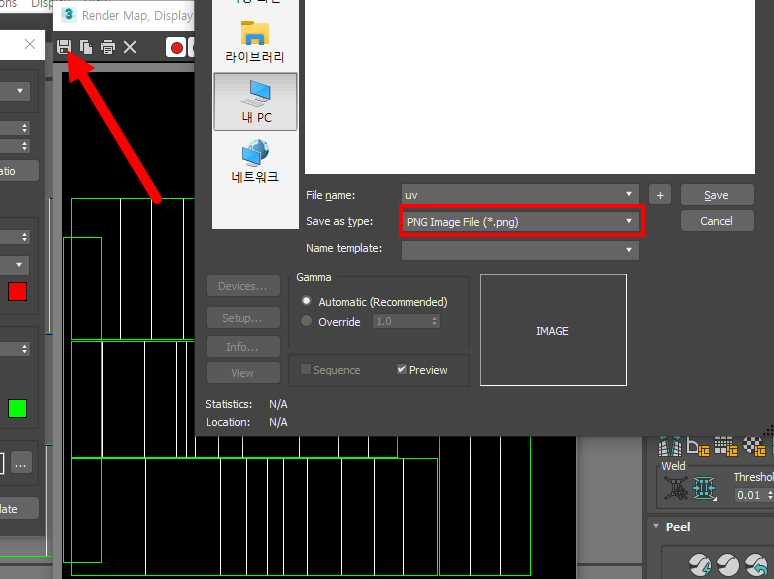 14)해상도를 설정하고 하단의 render UV template를 클릭하면 오브젝트의 UV를 렌더링한다.
