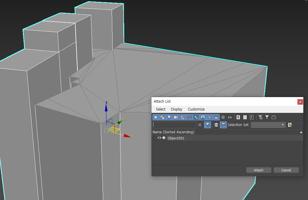 6)건물 모델 오브젝트를 선택하고 분리한 오브젝트를 소속시킨다(attach)