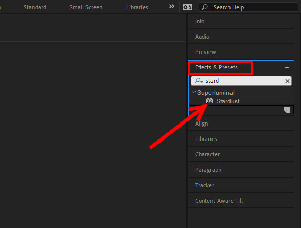 5)설치를 완료한 플러그인은 에프터이펙트의 몇가지 추가적인 메뉴에서 확인 가능합니다(업체의 플러그인 사용가이드 참고) 예를들어 effects로써 사용가능한 stardust 플러그인은 effects&presets에서 검색 가능합니다.