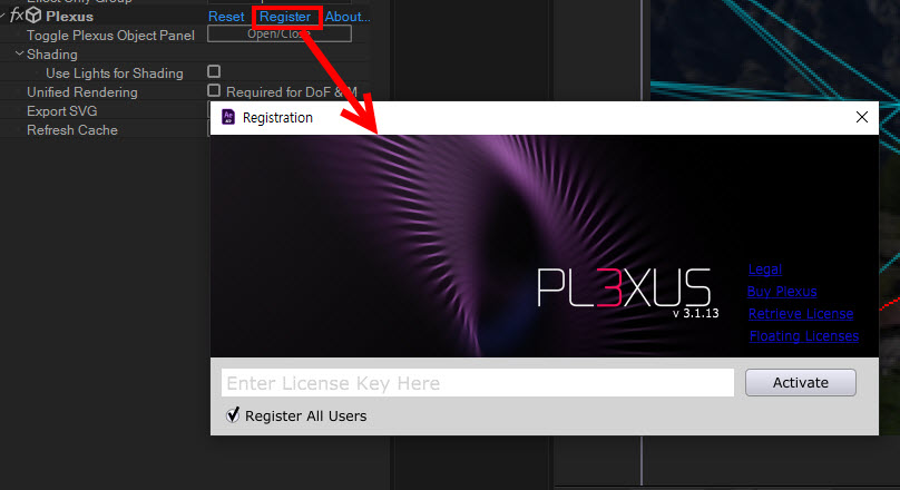 7)플러그인의 등록 메뉴(register)에서 제품의 라이센스 키를 입력하여 등록합니다.