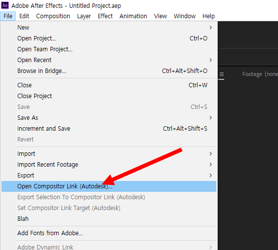 4)에프터이펙트를 실행하고 file 메뉴에서 open compositor link를 실행할수있습니다.