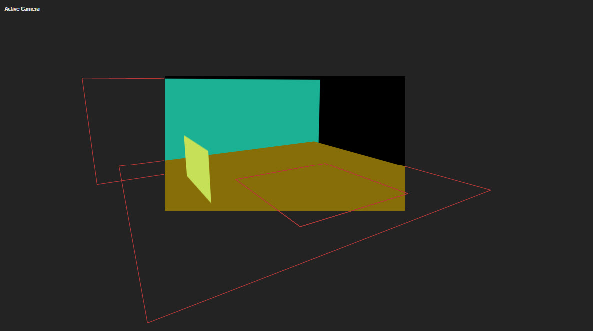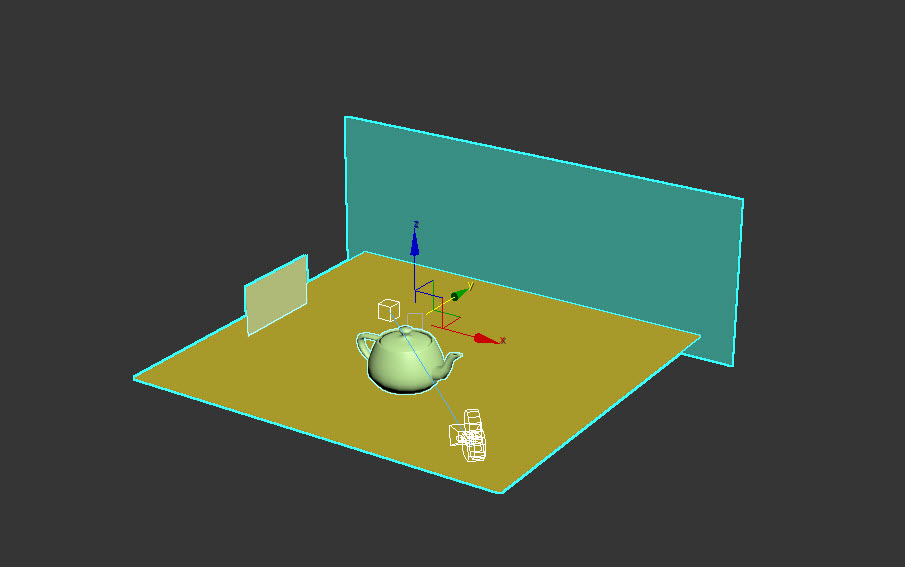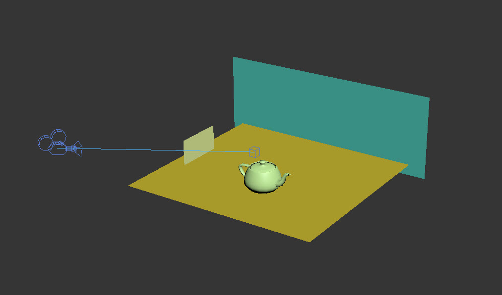1)3D맥스에서 씬을 구성합니다. 예에서 3개의 plane, 1개의 teapot, 애니메이션을 설정한 타겟 카메라로 씬을 구성하였습니다. (타겟 카메라, target camera 외에는 지원하지않습니다. 씬을 구성하는 오브젝트의 transform을 초기화, resetXform 하지않습니다. 4개를 초과하는 버텍스를 가지는 오브젝트는 지원하지않습니다)
