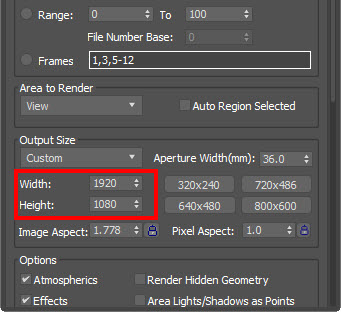 2)3D맥스의 렌더 설정(render settings)에서 해상도를 설정합니다. 이후에 에프터이펙트에서 fbx파일을 가져오기할때 동일한 해상도의 컴포지션을 생성합니다.