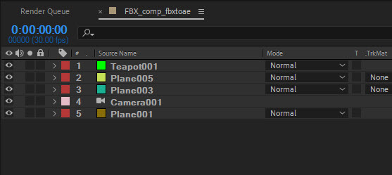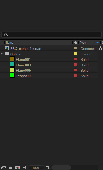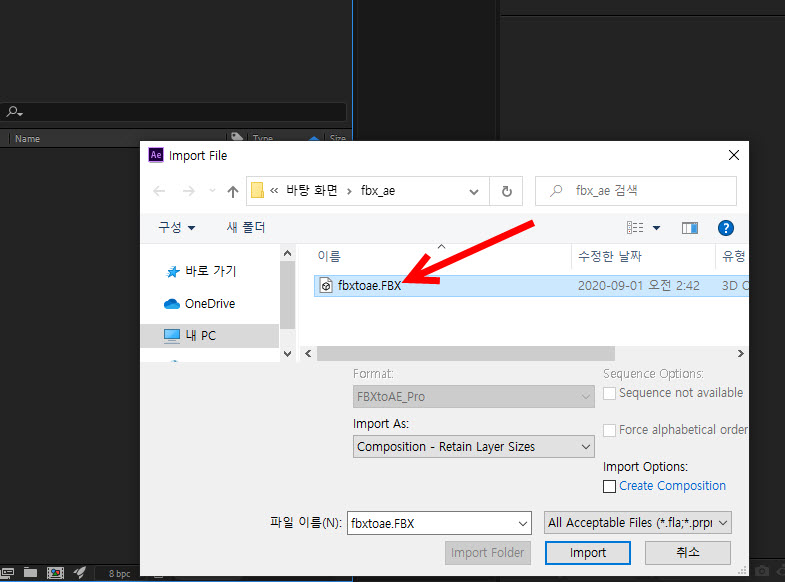 8)3D맥스에서 내보내기(export)한 fbx파일을 에프터이펙트에서 가져오기합니다(import)