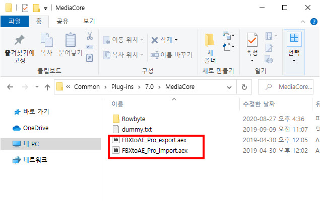 7)아래 폴더에 에프터이펙트 fbx to ae 플러그인 파일을 위치시킵니다.