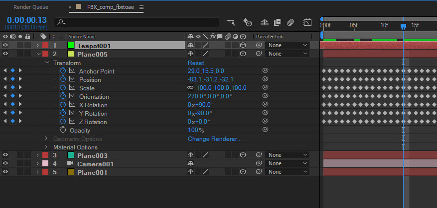9)맥스에서 저장한 오브젝트들(plane, teapot)에 대한 솔리드 레이어를 생성하며 솔리드 레이어와 카메라(target camera)를 구성하여 컴포지션을 생성한것을 확인할수있습니다.