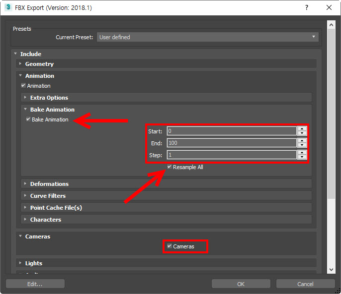 5)fbx export 옵션에서 bake animation에 체크하고 애니메이션의 프레임 범위를 설정한후 resample all에 체크하고 확인합니다.