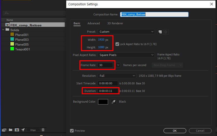 컴포지션을 선택하고 composition settings로 이동합니다. 맥스에서 설정한 해상도(width, height), 프레임레이트(frame rate), 지속시간(duration)이 설정되어있는것을 확인할수있습니다.